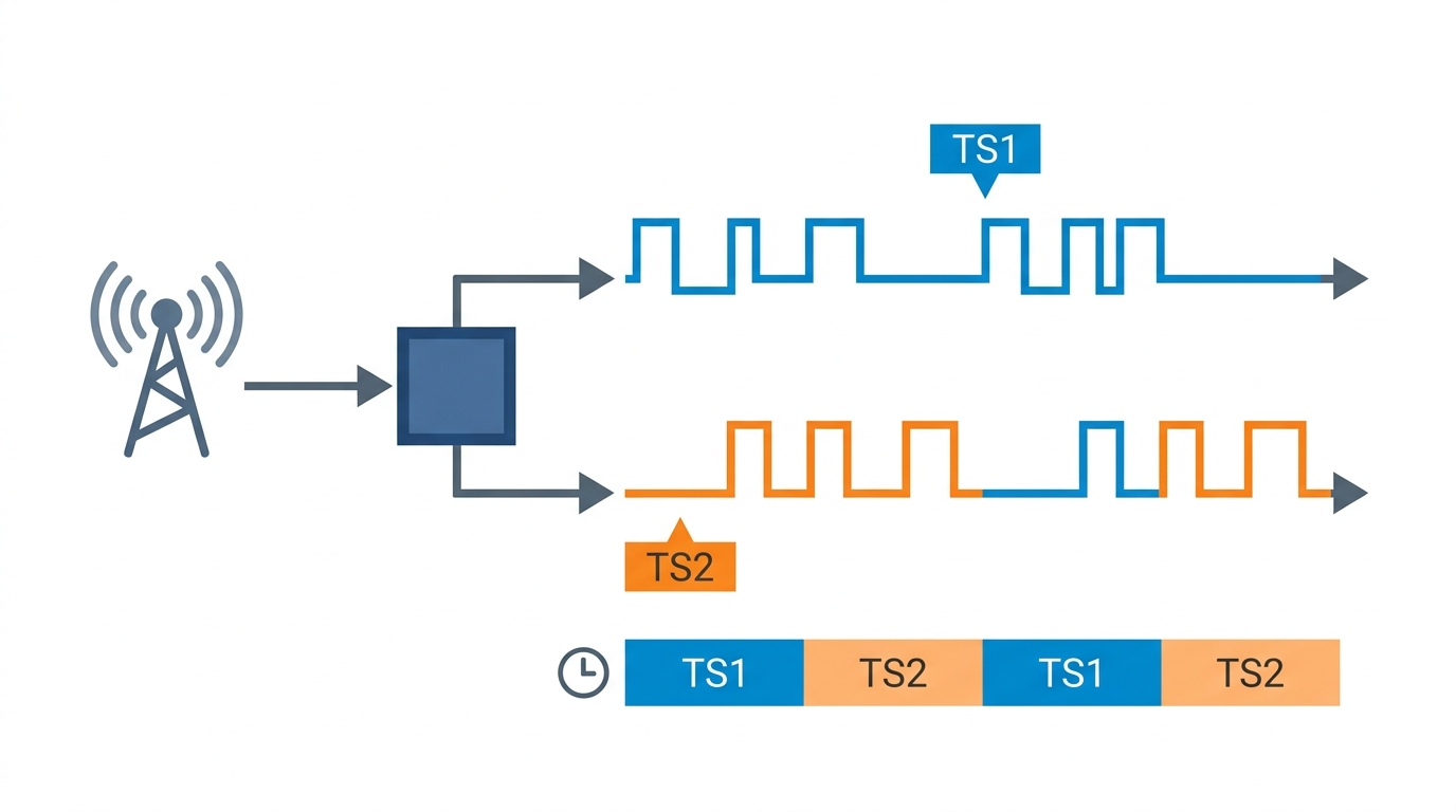 DMR uses a technique called TDMA, or Time Division Multiple Access. It splits a single 12.5 kHz channel into two alternating time slots, each roughly 30 milliseconds long. Slot 1 and Slot 2 take turns, switching back and forth so fast that both conversations sound continuous to the human ear. The result: two simultaneous conversations on one frequency, using the same bandwidth that analog FM uses for one.